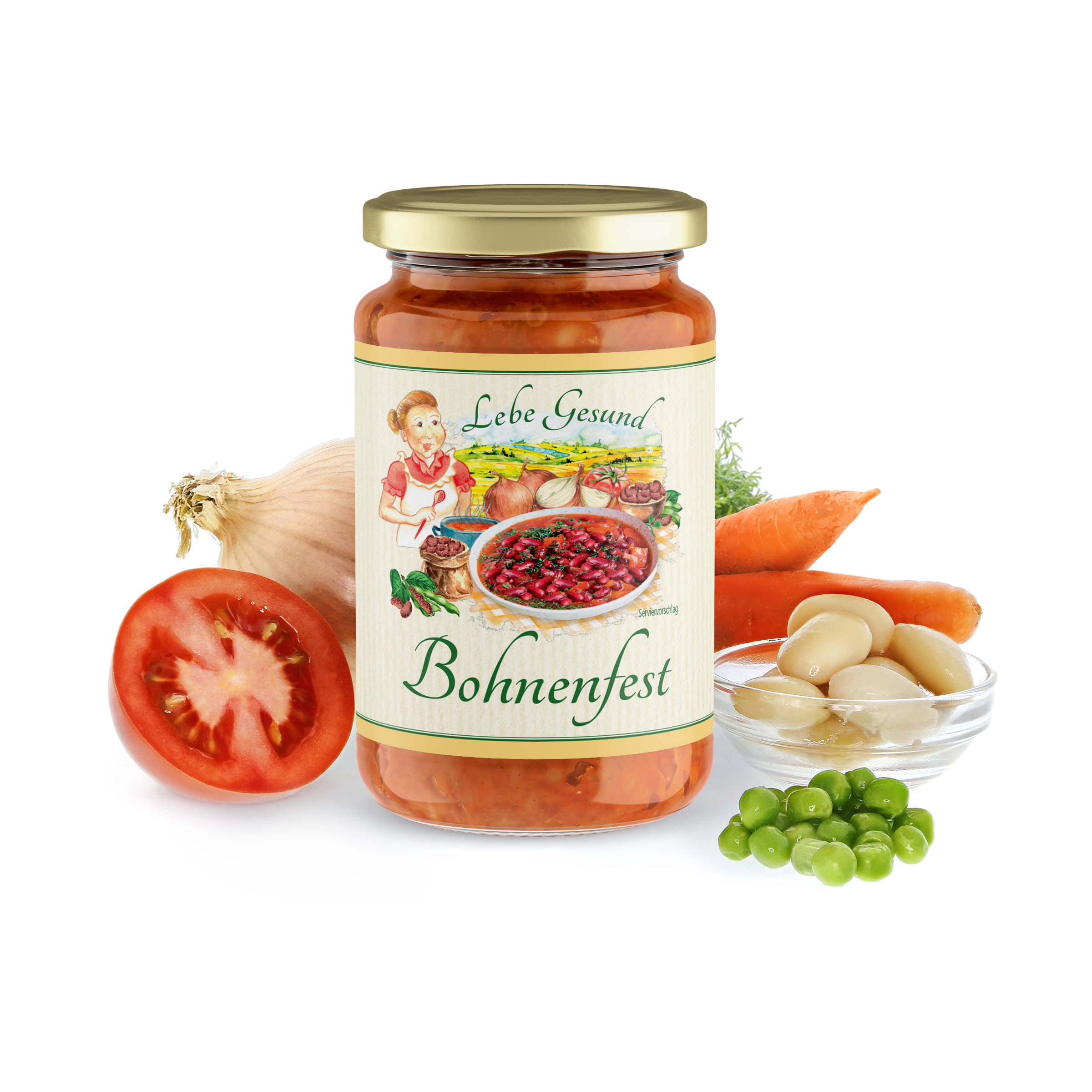 Bohnen* gekocht 43%, Wasser, Tomaten* 13%, Zwiebeln* 7%, Erbsen*, Sonnenblumenöl*, Karotten*, Tomatenmark* zweifach konzentriert 3%, Weizenmehl*, Steinsalz, Balsamico-Essig*, Weizensirup*, Gewürze*, Verdickungsmittel: Johannisbrotkernmehl*, Maismehl*