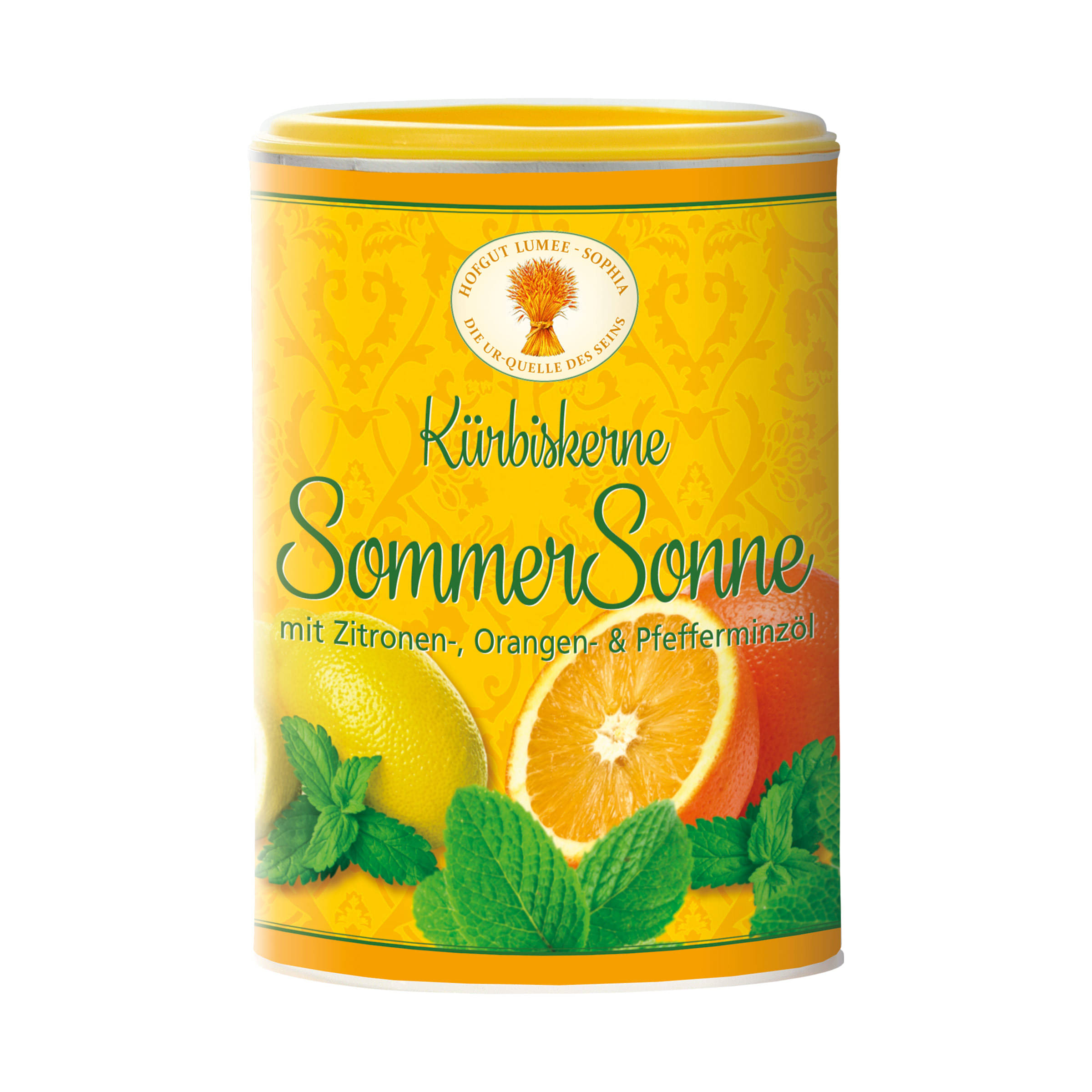 Kürbiskerne* 71%, Rohrohrzucker*, natürliche Öle* in veränderlichen Gewichtsanteilen 0,3% (Zitronenöl*, Orangenöl*, Pfefferminzöl*)