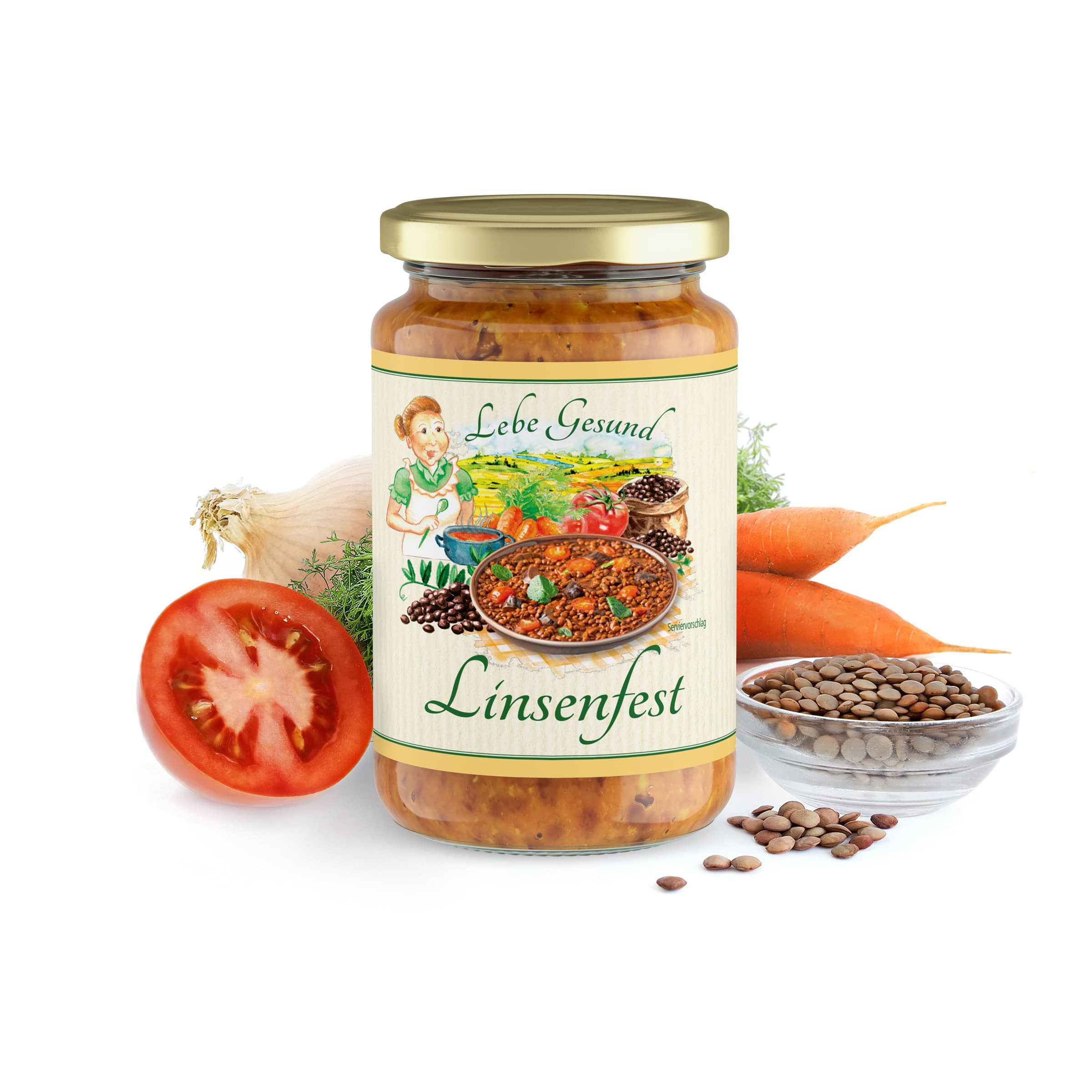 Unser Linsen-Fest hält, was sein Name verspricht: es ist ein Festschmaus aus besten Linsen! Der vegane Bio-Linseneintopf schmeckt herzhaft lecker und ist blitzschnell zubereitet. Auch kalt aufs Brot oder einfach aus dem Glas gelöffelt, ist das Linsen-Fest ein Genuss - zuhause, im Büro oder unterwegs.