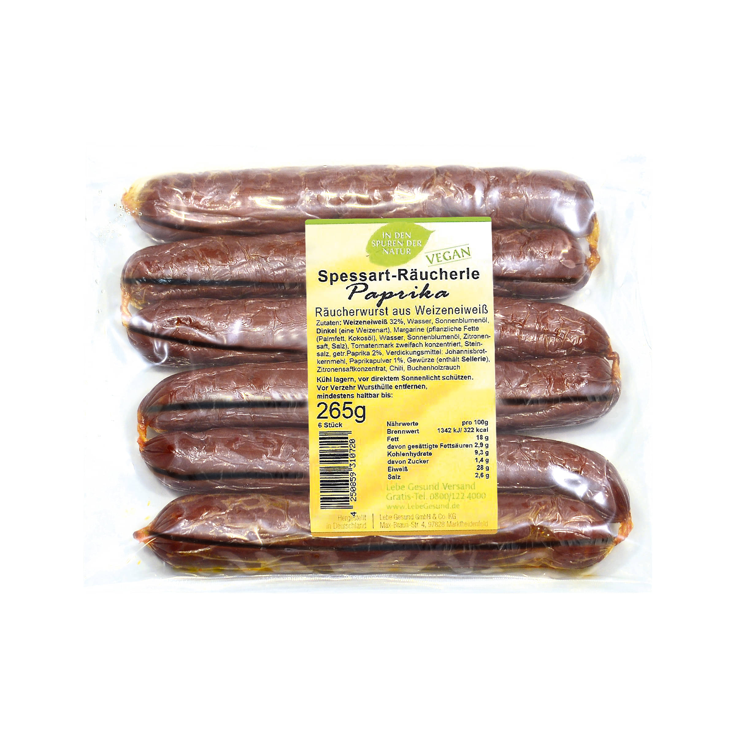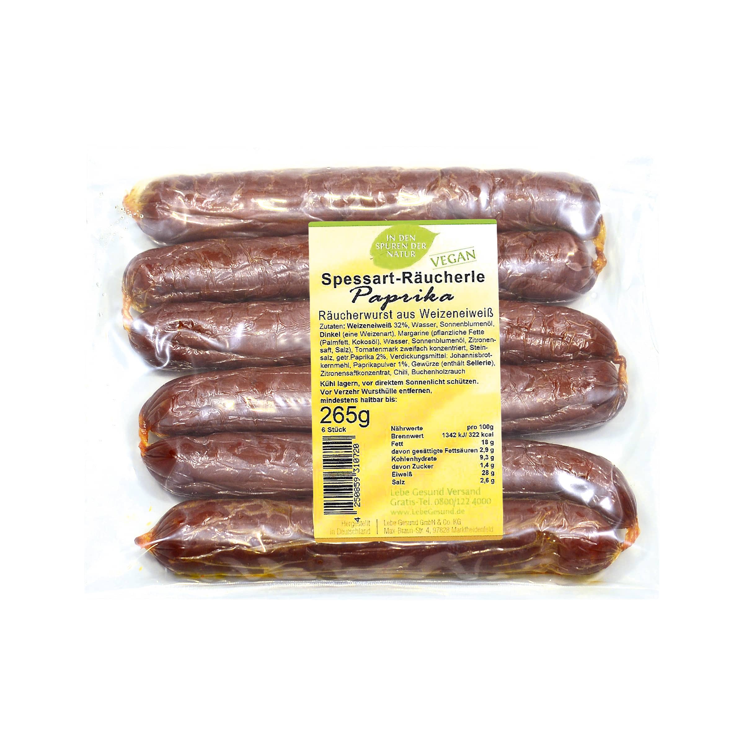 Weizeneiweiss 32%, Wasser, Sonnenblumenöl, Dinkel (eine Weizenart), Margarine (pflanzliche Fette (Palmfett, Kokosöl), Wasser, Sonnenblumenöl, Zitronensaft, Salz), Tomatenmark zweifach konzentriert, Steinsalz, getr. Paprika 2%, Verdickungsmittel: Johannisbrotkernmehl, Paprikapulver 1%, Gewürze (enthält Sellerie), Zitronensaftkonzentrat, Chili, Buchenholzrauch