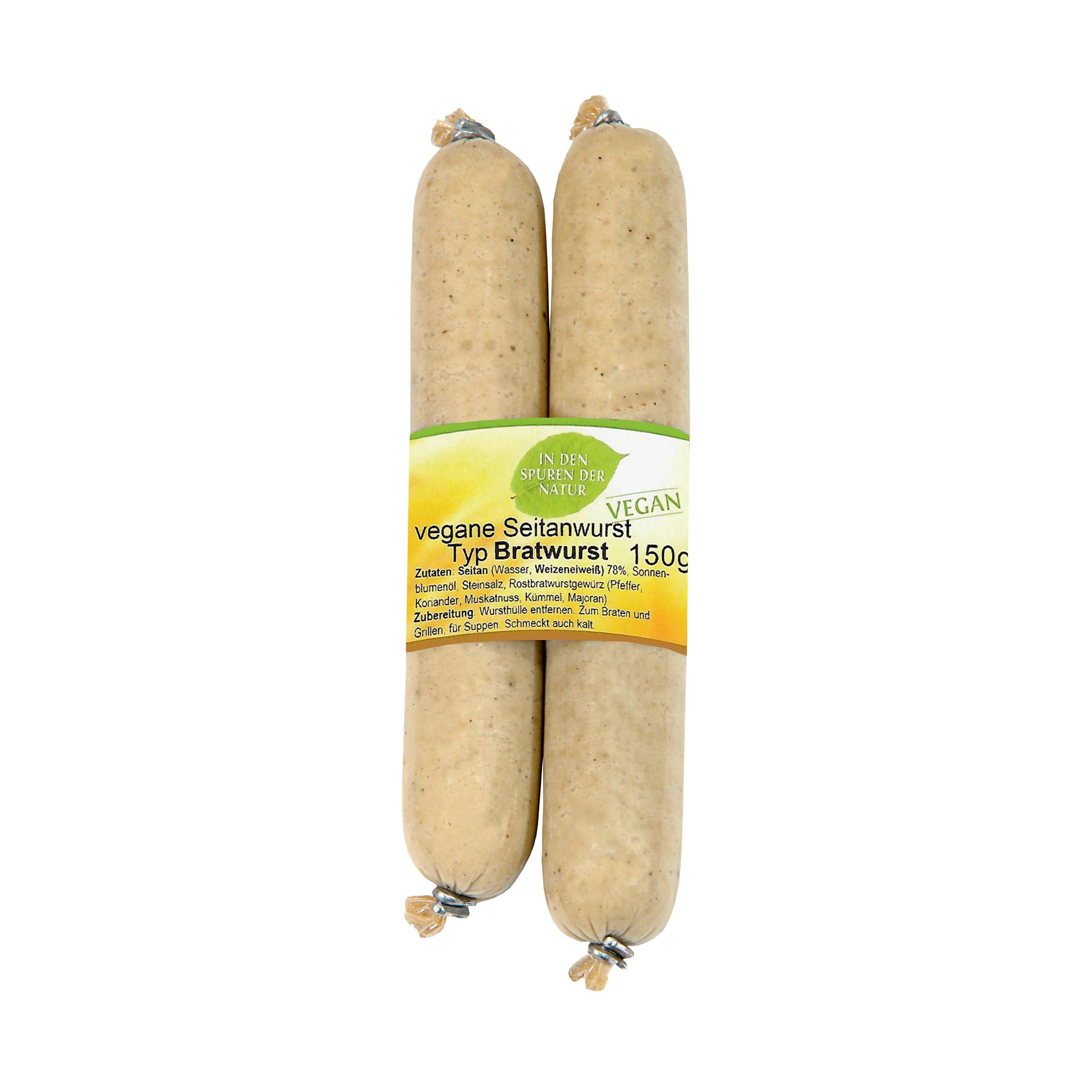 Seitan (Wasser, Weizeneiweiss) 78%, Sonnenblumenöl, Steinsalz, Rostbratwurstgewürz (Pfeffer, Koriander, Muskatnuss, Kümmel, Majoran)