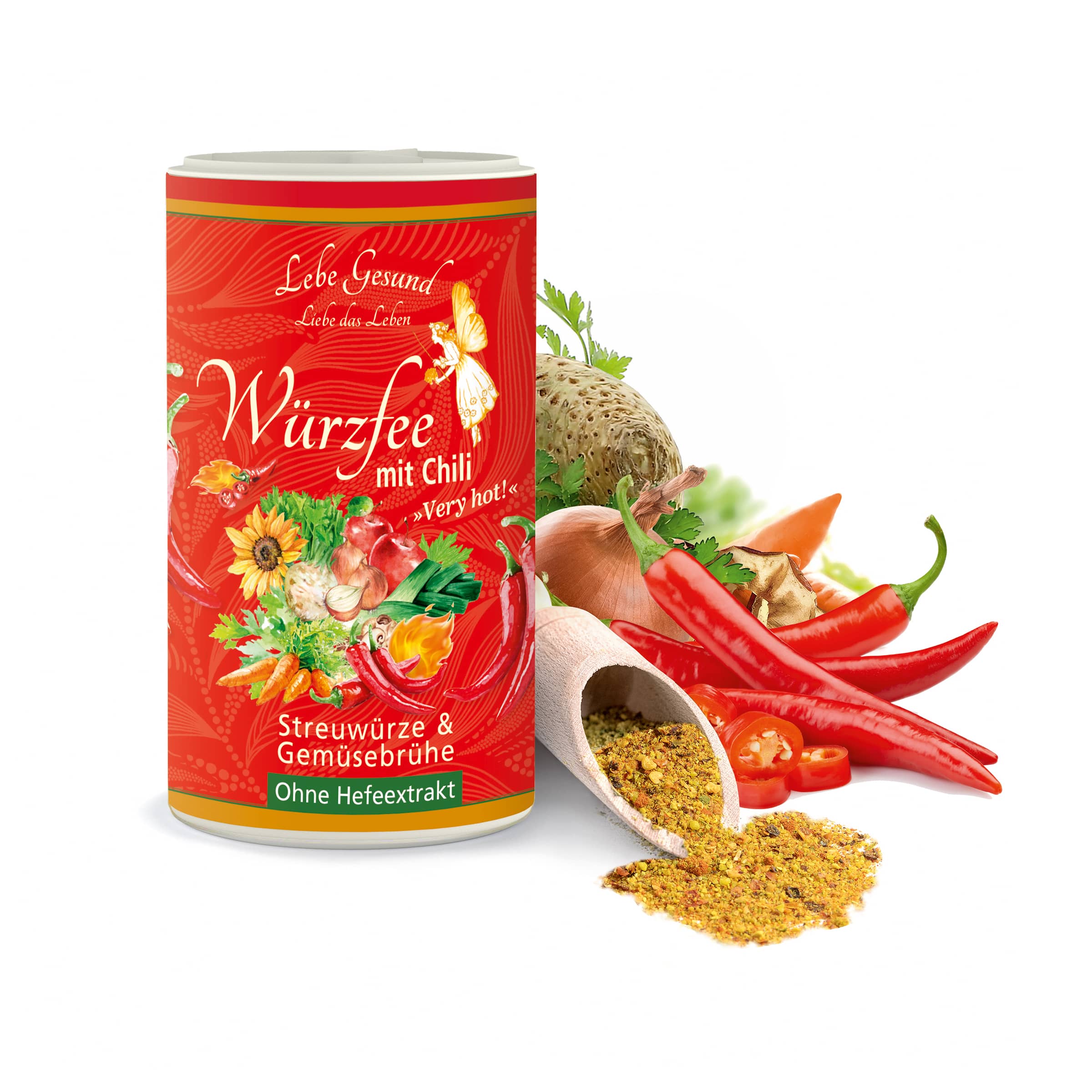 Steinsalz 31%, Chili* 19%, getrocknetes Gemüse in veränderlichen Gewichtsanteilen 13% (Karotten*, Zwiebeln*, Pastinaken*, Sellerie*, Lauch*, Petersilienwurzel*), Paprika 12%, Hirse* 11%, Pfeffer*, Äpfel* 3%, Petersilie* 2%, Sonnenblumenöl* 0,92%, Curcuma*, Shiitakepilze* 0,41%, Liebstöckel* 0,34%